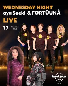 今年ラストのライブイベントはハードロックカフェ東京オフィシャルバンド「WEDNESDAY NIGHT」、オフィシャルシンガーの「aya Sueki」、そして篠笛奏者の「FØRTÜUNÅ」が揃い踏み!オールスターキャストで2025年を締め括ります!必見!